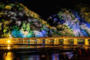 嵐山の渡月橋周辺は、紅葉と川の流れ、山並みが調和した京都屈指の秋景色スポット。嵐山花灯路のライトアップイベントがあれば、夜も楽しめます。トロッコ列車からの眺めもおすすめ。