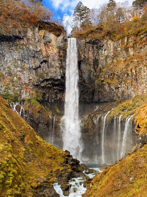 湯滝は迫力ある滝と紅葉が間近に見られるスポット。滝壺周辺の展望台や遊歩道も整備されていて、草紅葉も見逃せません。湯ノ湖周辺とのセット散策もおすすめです。