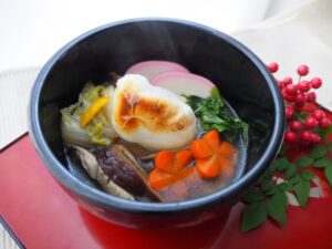 お雑煮とは、お餅をメインにした汁物料理で、主にお正月に食べられます。だしの効いたスープに野菜や肉、魚などを加え、地域や家庭ごとのバリエーションが楽しめるのが特徴です。