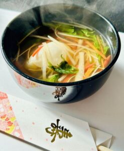 4. 器に餅を入れ、白味噌の汁を注ぎ、三つ葉を飾って完成
